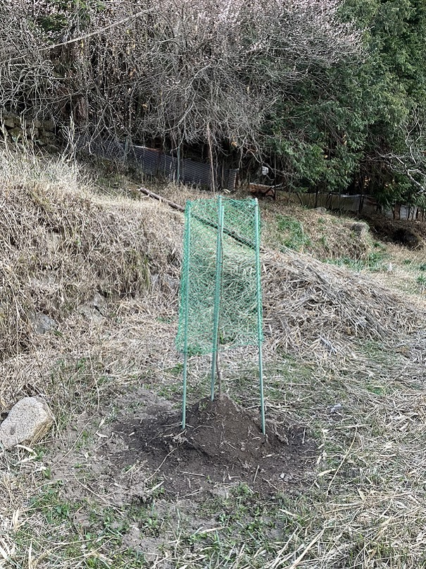 ↓栗畑では、新しい苗を植える準備中。穴を掘っています。