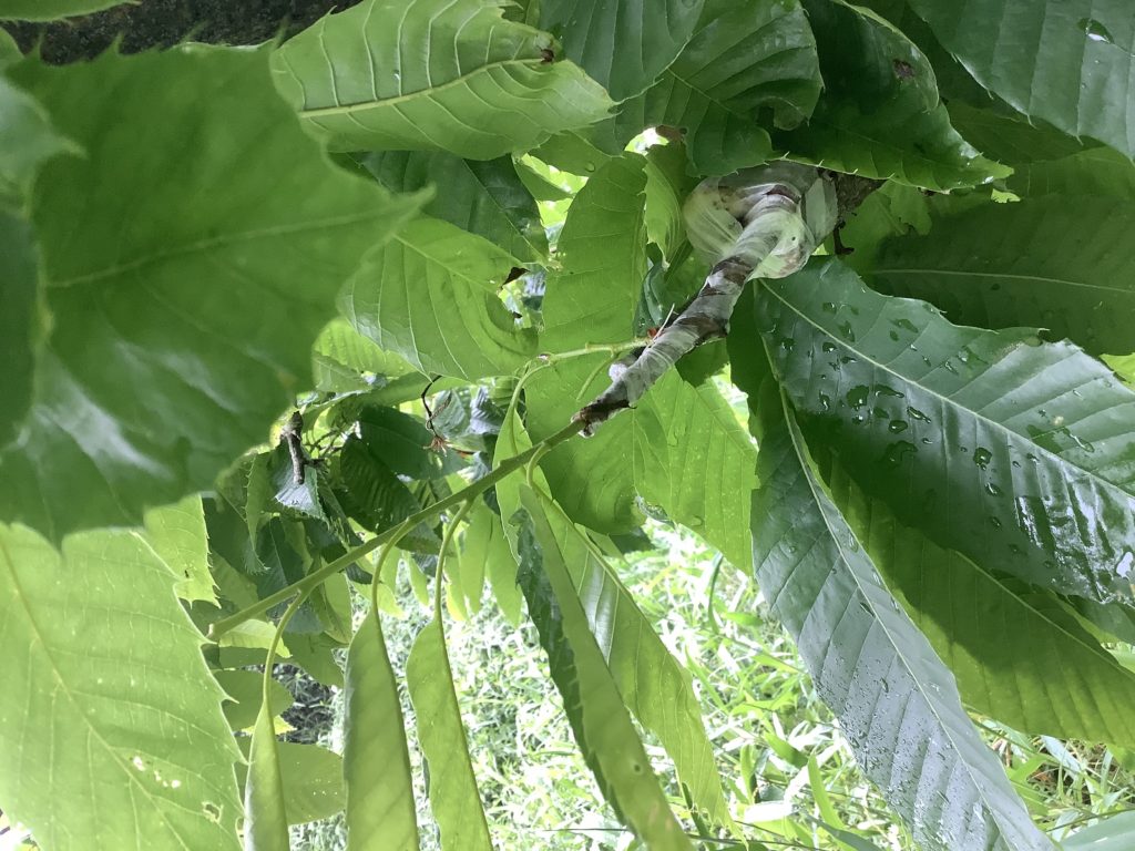 雨の中、栗畑作業。接ぎ木と開花のようす