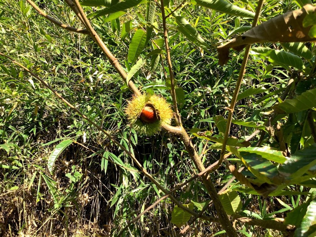上の写真は、また別の古木で、一部は熟して栗の実が落ちてきていました。