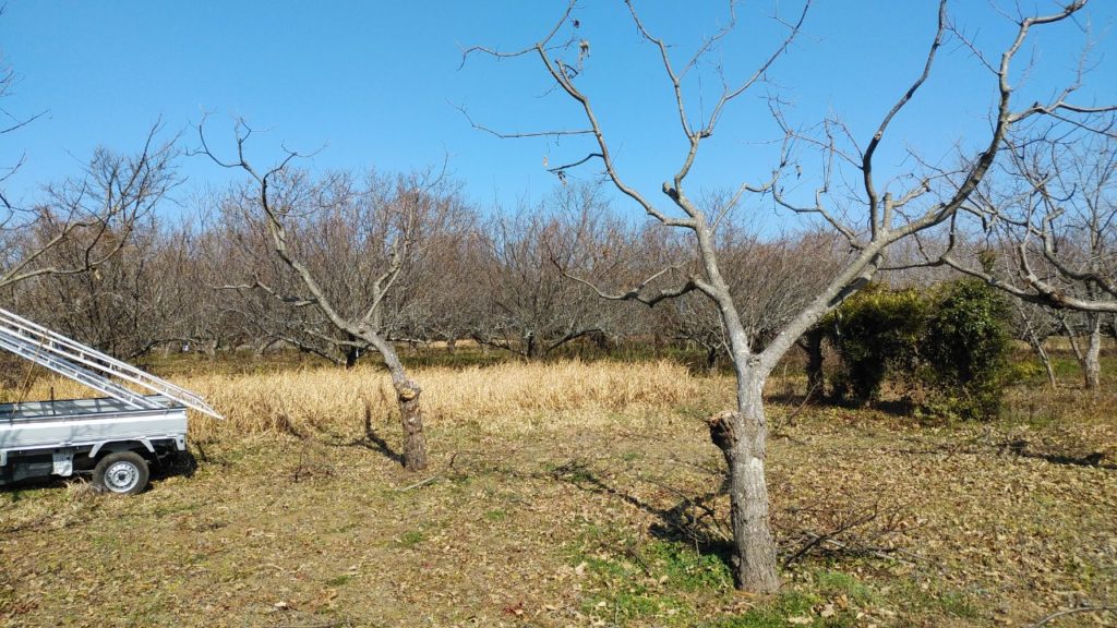 さて、オガタマ栗農園では、毎年の作業のひとつ、栗の木の剪定を行っています。